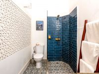 La salle de bain est très spacieuse et comprend une douche, des toilettes individuelles et un lavabo.
